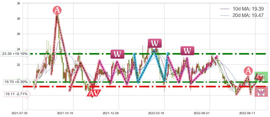 ♘ 阻力价格位19.70,可信任强度81.60%,距离最后交易2022-08-12形成的收盘价格19.64相差 +0.30%