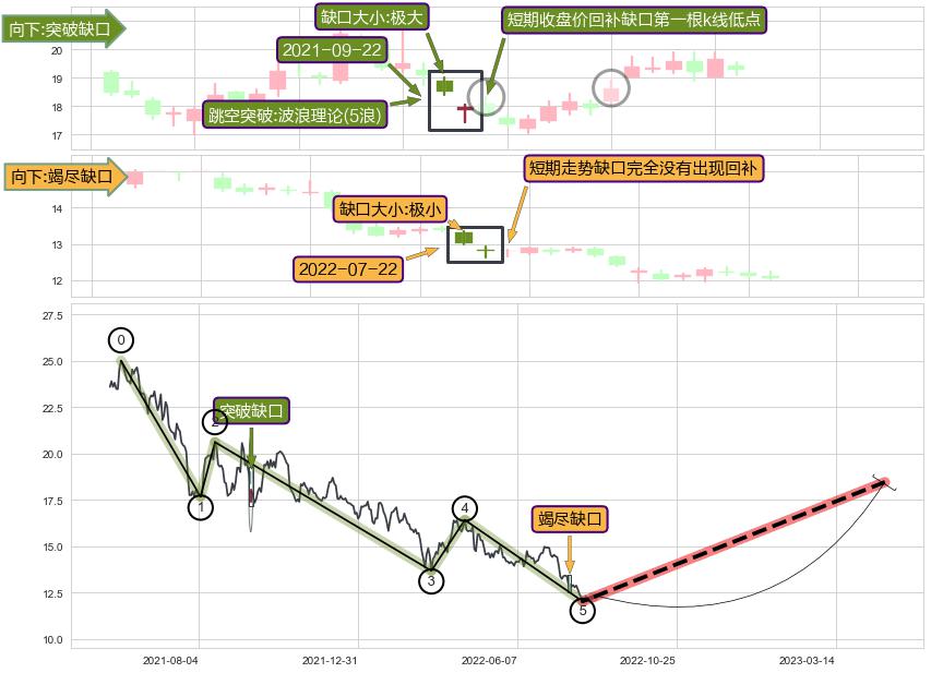 ➢ 突破缺口形成后,后续k已经超过14根,跳空突破波浪理论(5浪)关键点后, 出现【完全回踩】迹象,短期收盘价回补缺口第一根k线低点