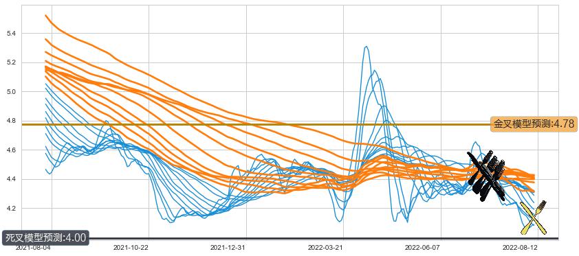 ➣ 60小时均线于(2022-07-13: 4.39)形成【死叉】基于【死叉历史模型】预测死叉后最低波谷价格: 3.890, 死叉后最低价格4.00,尚未达到预测最低波谷价格, 预期继续下跌