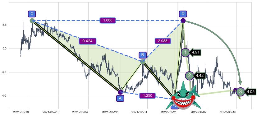 ➢ 谐波鲨鱼:d下跌即将临近第❸目标:猜想支撑拉升 → 上涨 →【拐点】机会信号 → 大趋势均值回复