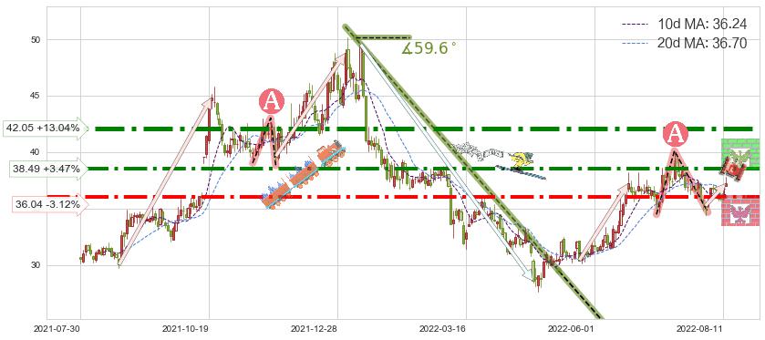 ♘ 阻力价格位38.49,可信任强度70.73%,距离最后交易2022-08-12形成的收盘价格37.20相差 +3.47%