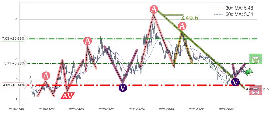 ♘ 阻力价格位5.77,可信任强度46.24%,距离最后交易2022-08-01形成的收盘价格5.59相差 +3.26%