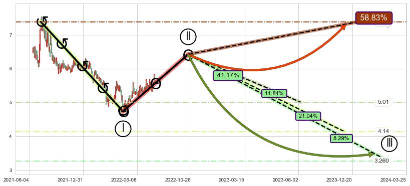 ➣ 循环浪继续向下【平均值】位置(2023-11-30, 4.14),匹配聚类样本比例51.12%, 可能性概率21.04%