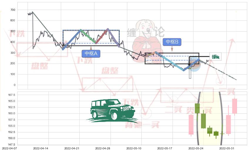 ➣ 缠论中枢点:下降缠中枢B破位后距离1买距离较远,随后猜想后续持续下跌(趋势跟踪)