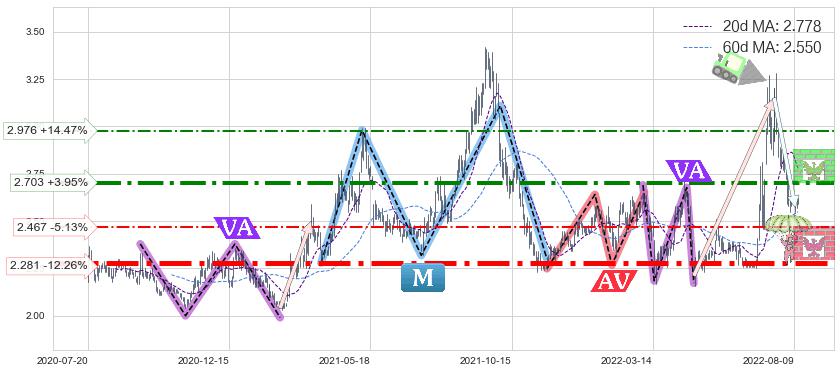 ♘ 阻力价格位2.976,可信任强度52.15%,距离最后交易2022-08-12形成的收盘价格2.600相差 +14.47%