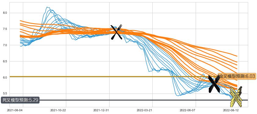 ➢ 34小时均线于(2022-07-06: 5.83)形成【死叉】基于【死叉历史模型】预测死叉后最低波谷价格: 5.39, 死叉后最低价格5.17,已经下跌超出预测最低波谷价格, 预期反弹