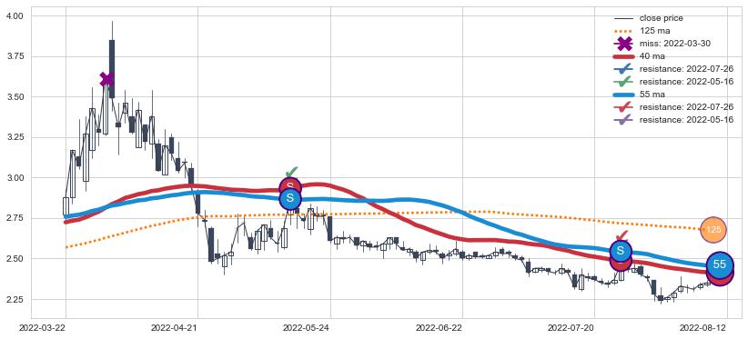 ➣ 55小时均线于(2022-04-20: 2.906)形成【死叉】基于【死叉历史模型】预测死叉后最低波谷价格: 2.627, 死叉后最低价格2.240,已经下跌超出预测最低波谷价格, 预期反弹