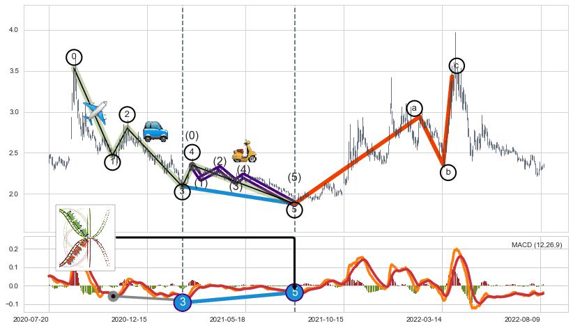 ➣ 第一, 三, 五浪下跌动能逐渐【衰弱变小】,趋势呈现不稳迹象