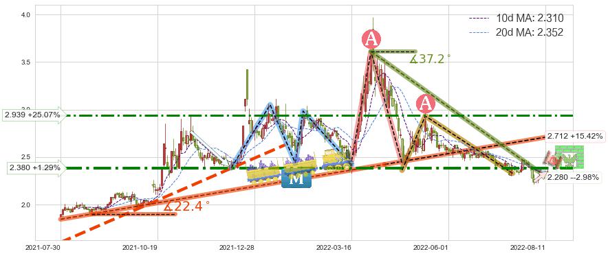 ♘ 阻力价格位2.380,可信任强度78.71%,距离最后交易2022-08-12形成的收盘价格2.350相差 +1.29%