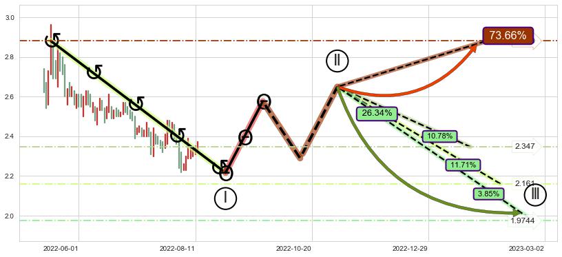 ➣ 循环浪继续向下【平均值】位置(2023-02-10, 2.161),匹配聚类样本比例44.45%, 可能性概率11.71%