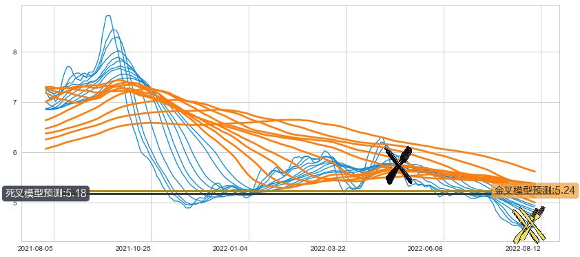 ➣ 34小时均线于(2022-05-05: 5.68)形成【死叉】基于【死叉历史模型】预测死叉后最低波谷价格: 5.27, 死叉后最低价格4.38,已经下跌超出预测最低波谷价格, 预期反弹