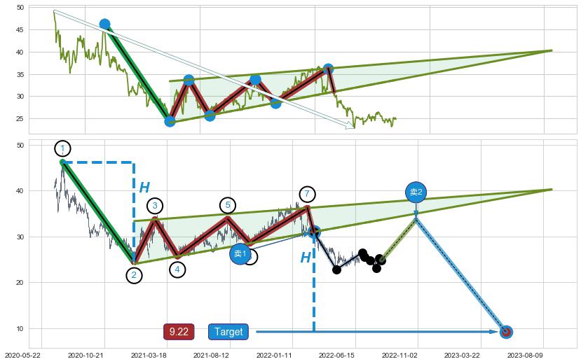 ➢ 最小中继整理跌幅→𝐇: 21.78 (𝐇楔型旗杆的长度:楔型起点→顶点)