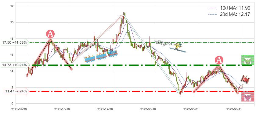 ♘ 阻力价格位17.50,可信任强度54.83%,距离最后交易2022-08-12形成的收盘价格12.36相差 +41.58%