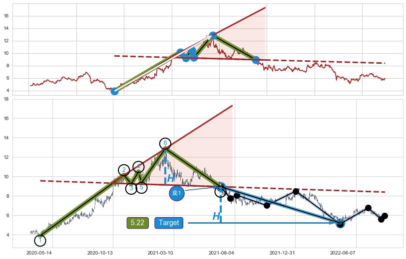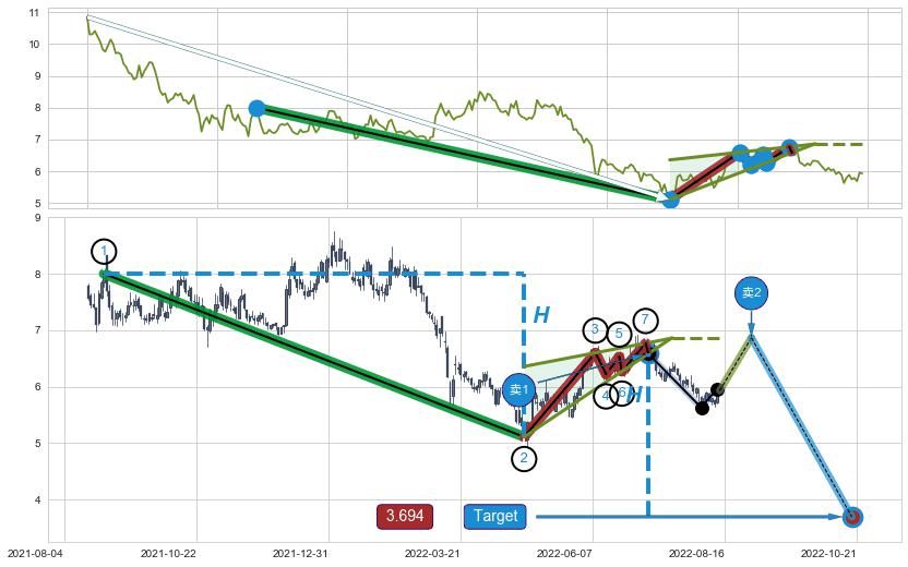 ➣ D点拟合预测价格8.17,距离最后交易收盘价格5.93相差 +37.82%