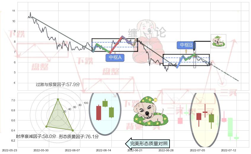 ➢ 【中枢B】:2022-05-24-2022-07-05,中枢由4笔构成,共30交易日, ZG=6.60, ZD=6.22