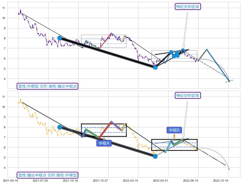 ➣ 缠论中枢点:猜想破位中枢B后持续下拉 → 下跌 → 破位中枢B支撑 → 持续趋势跟踪