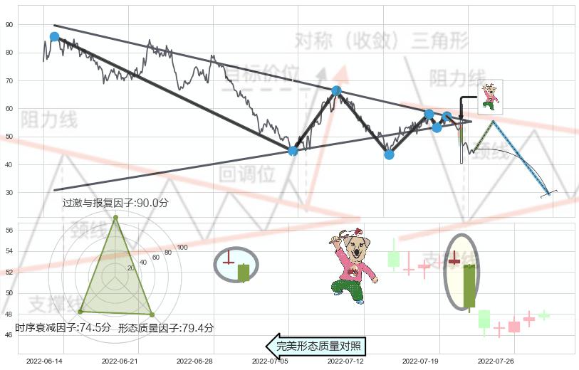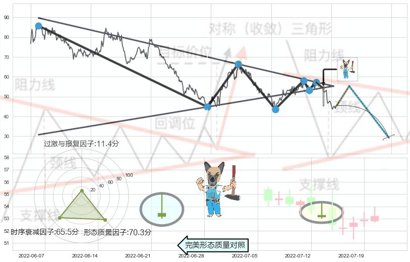 ➢ 【卖1】: 激进型 卖点→(2022-07-12: 54.40 )形成突破下降【对称】三角形整理【整理】形态