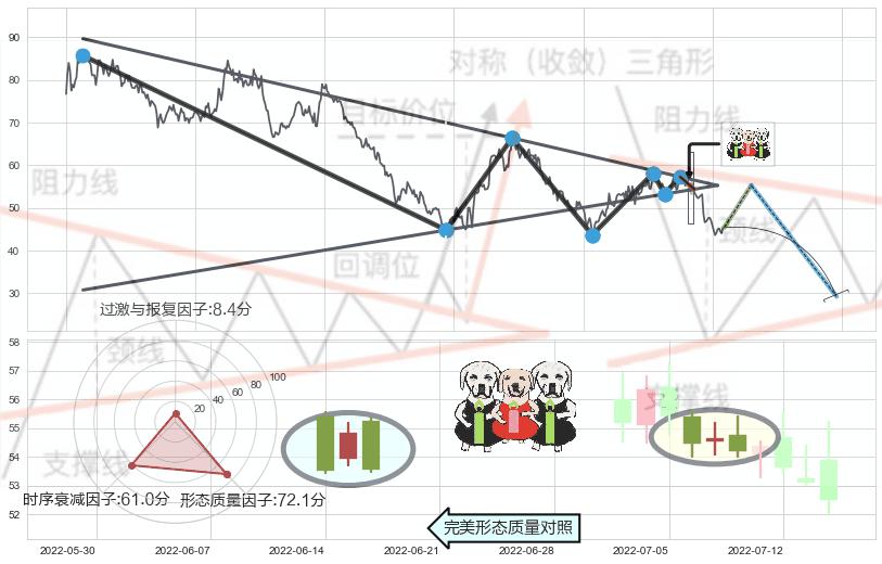 ➣ 【多空双方观望→争持→促使价格波动日益狭窄→空方打破攻守平衡点】对称三角形中继整理, 已在2022-07-12突破【支撑】颈线 54.40 →演变成下降通道