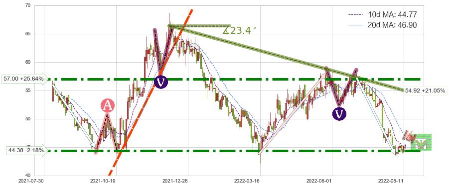 ♘ 阻力价格位44.38,可信任强度89.93%,距离最后交易2022-08-12形成的收盘价格45.37相差 -2.18%