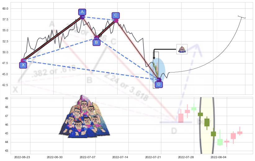 ➢ 谐波螃蟹:c下跌到达d:猜想拉升 → 上涨 →【拐点】强支撑临近 → 大趋势均值回复