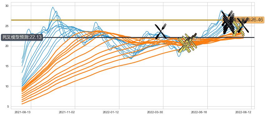 ➢ 30小时均线于(2022-07-20: 26.15)形成【死叉】基于【死叉历史模型】预测死叉后最低波谷价格: 23.69, 死叉后最低价格22.90,已经下跌超出预测最低波谷价格, 预期反弹