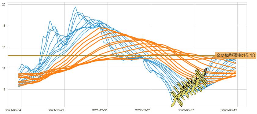 ➣ 70小时均线于(2022-06-10: 12.69)形成【金叉】基于【金叉历史模型】预测金叉后最高波峰价格: 15.43, 金叉后最高价格15.59,虽然已经到达预测最高波峰价格,但耗时间很短动能很强, 预期继续上涨