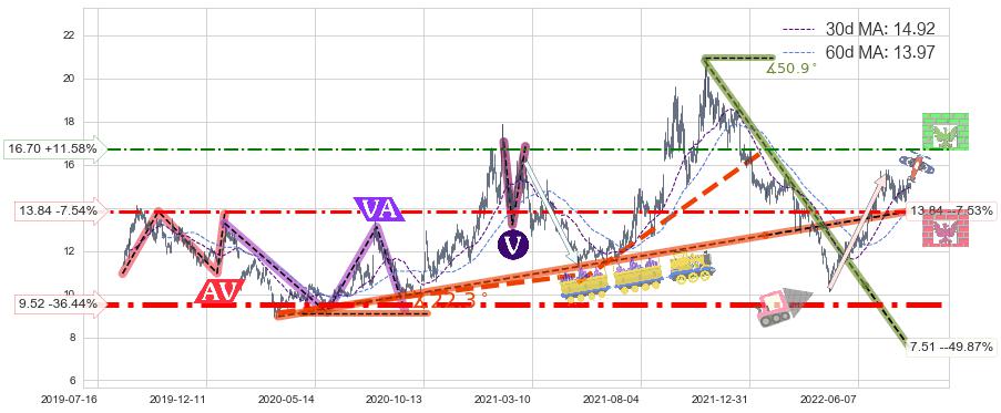 ♘ 支撑价格位13.84,可信任强度65.32%,距离最后交易2022-08-12形成的收盘价格14.97相差 -7.54%