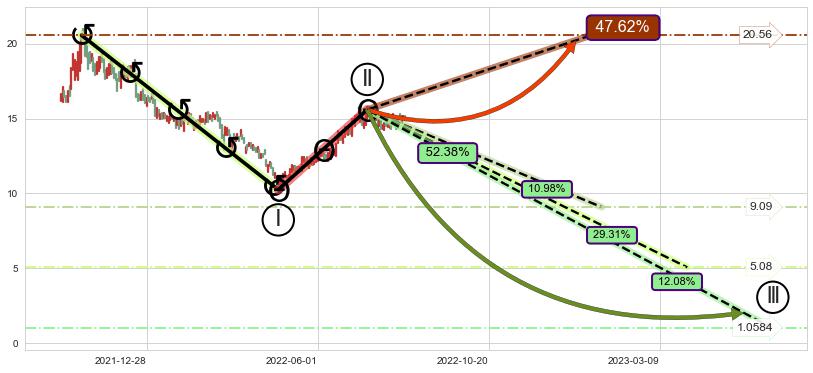 ➣ 调整浪已超过预测的c点位置,后续大趋势循环浪继续下跌概率52.38%,谨慎做多