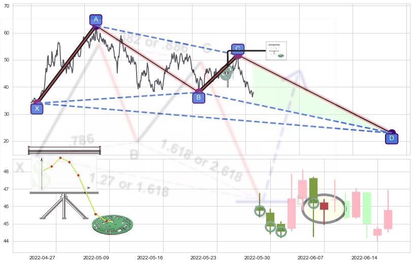 ➢ 谐波蝴蝶:b上拉接近c:猜想阻力性下沉 → 下跌 →【拐点】阻力临近 → 大趋势均值回复