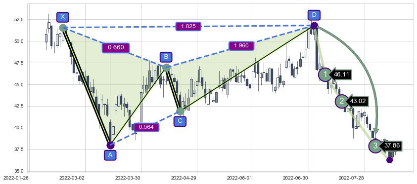 ➢ 谐波伽利:d下跌已到达第❸目标:猜想支撑拉升 → 上涨 →【拐点】机会信号 → 大趋势均值回复