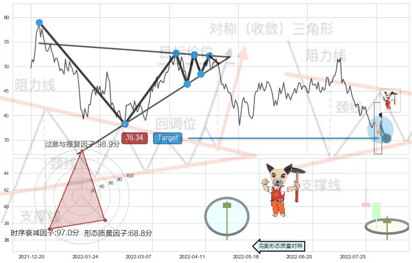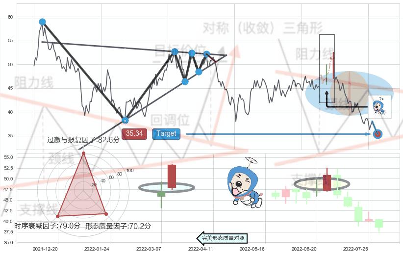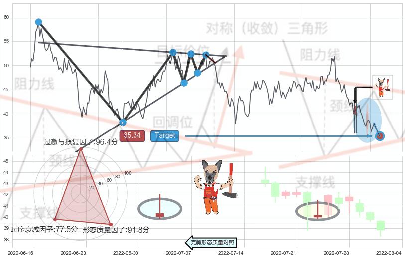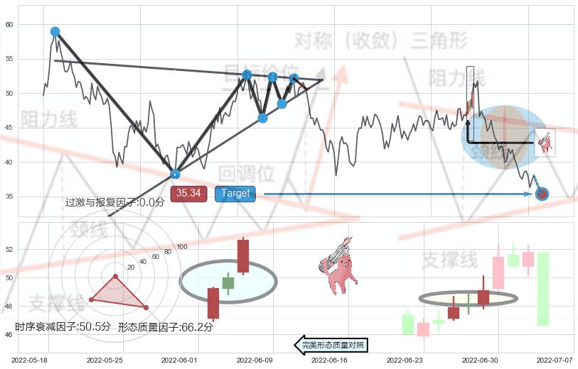 ➢ 锤头线(锤子线) 🔜 下降对称三角整理临近target支撑拐点上涨 综合量化分数:59.20 【偏多】