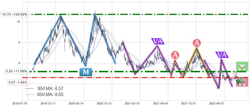 ♘ 阻力价格位5.20,可信任强度87.26%,距离最后交易2022-08-12形成的收盘价格4.68相差 +11.06%