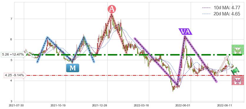 ♘ 阻力价格位5.26,可信任强度90.68%,距离最后交易2022-08-12形成的收盘价格4.68相差 +12.47%