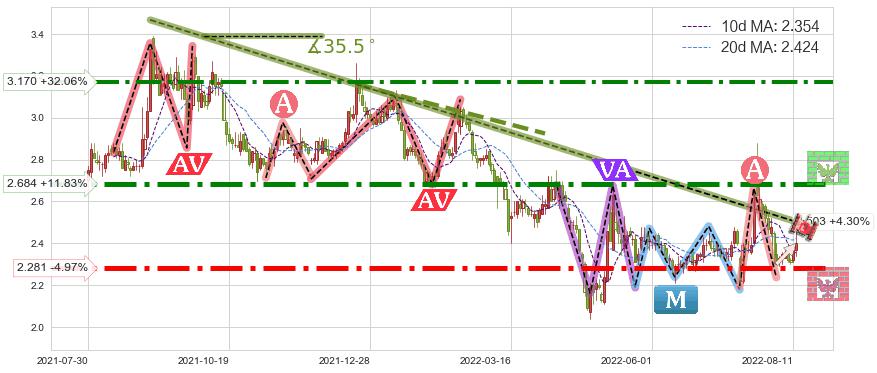 ♘ 阻力价格位3.170,可信任强度81.93%,距离最后交易2022-08-12形成的收盘价格2.400相差 +32.06%