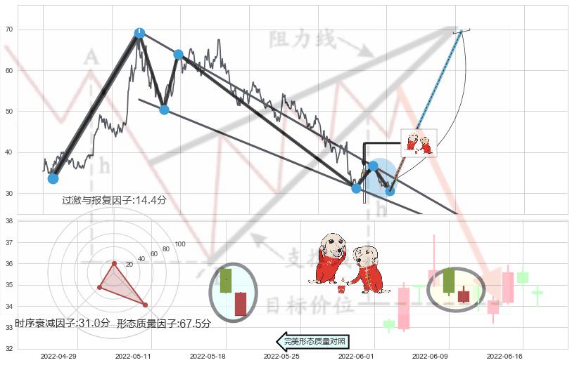 ➣ 好友反攻 + 降楔型临近阻力猜想转换支撑上涨信号叠加后【目标达成率】中等,【看多】信号叠加【存续影响中等】