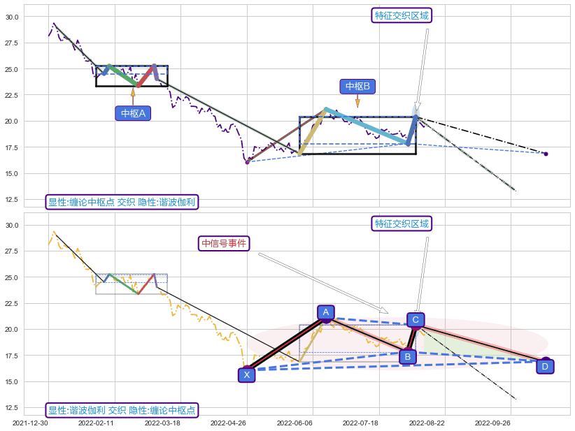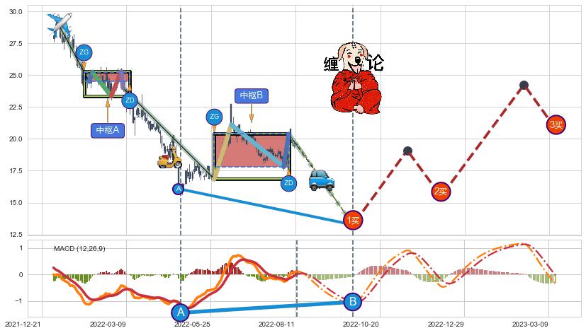 ➣ 缠论中枢点:猜想破位中枢B后持续下拉 → 下跌 → 破位中枢B支撑 → 持续趋势跟踪