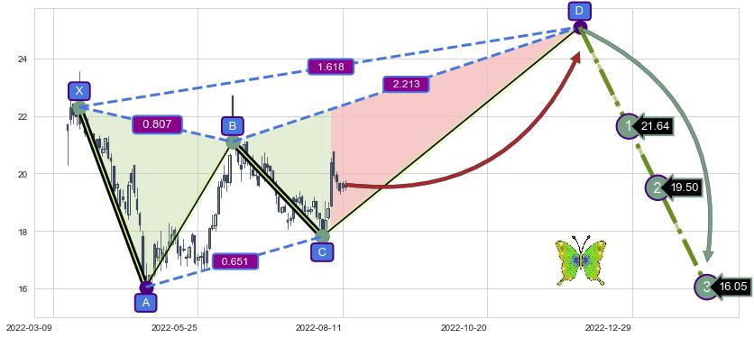 ➣ 未完成【蝴蝶】形态起点X: 2022-03-22, 已到达C点: 2022-08-02, 预测最终D点: 2022-12-05, 共169交易日