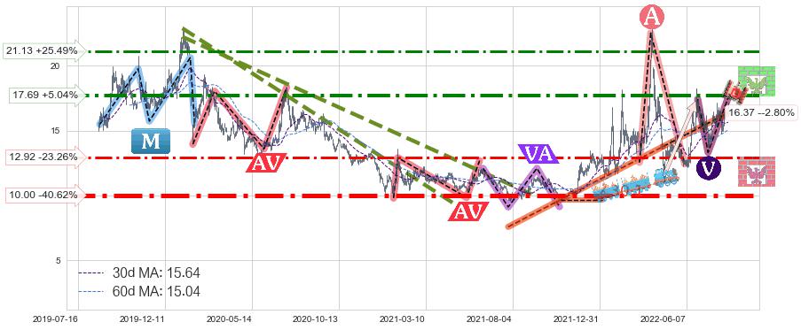 ♘ 阻力价格位17.69,可信任强度83.95%,距离最后交易2022-08-12形成的收盘价格16.84相差 +5.04%