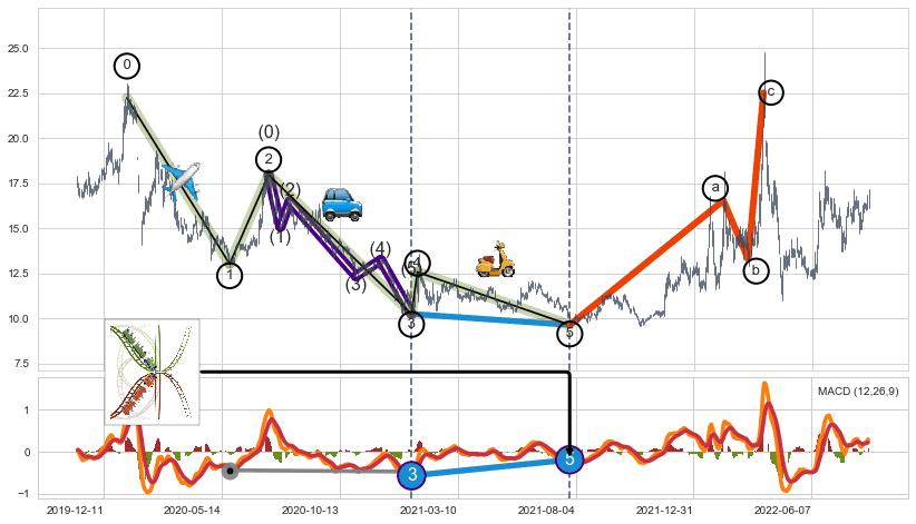 ➣ 波浪理论:猜想达到c点后小反弹终止反转下跌 → 下跌 → 【拐点】临近 → 阶段均值回复结束后继续大周期趋势跟踪