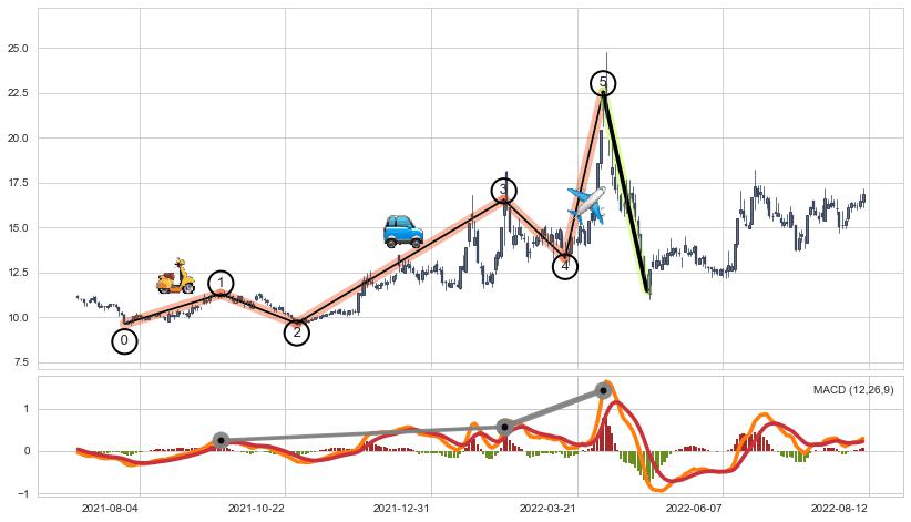 ➢ 波浪理论:猜想击穿突破c点后继续上涨 → 上涨 → 机会信号 → 小趋势跟踪