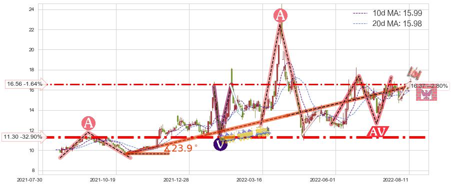 ♘ 支撑价格位16.56,可信任强度68.63%,距离最后交易2022-08-12形成的收盘价格16.84相差 -1.64%