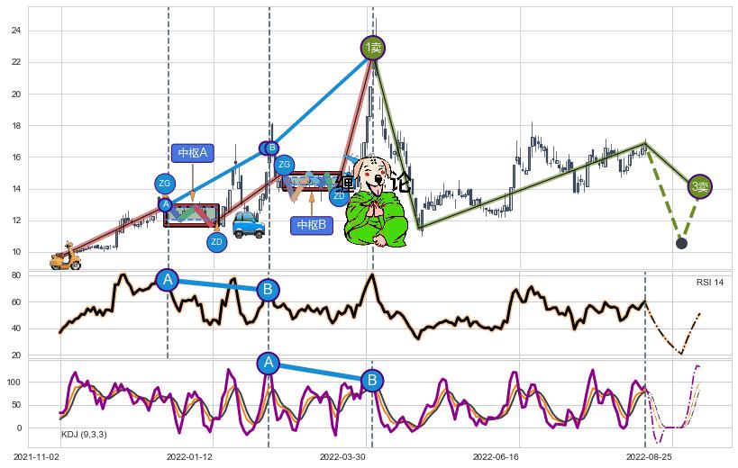 ➣ 【中枢B】:2022-02-21-2022-03-17,中枢由7笔构成,共19交易日, ZG=14.43, ZD=14.20