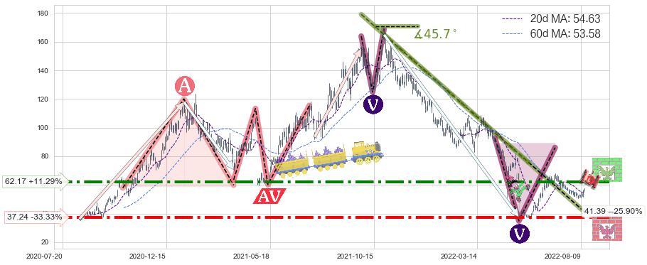 ♘ 阻力价格位62.17,可信任强度83.25%,距离最后交易2022-08-12形成的收盘价格55.86相差 +11.29%