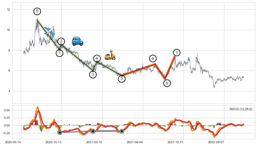 ➣ 波浪理论:猜想达到c点后小反弹终止反转下跌 → 下跌 → 【拐点】临近 → 阶段均值回复结束后继续大周期趋势跟踪