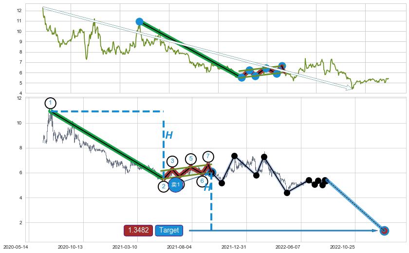 ➣ 缠论中枢点:猜想破位中枢B后持续下拉 → 下跌 → 破位中枢B支撑 → 持续趋势跟踪