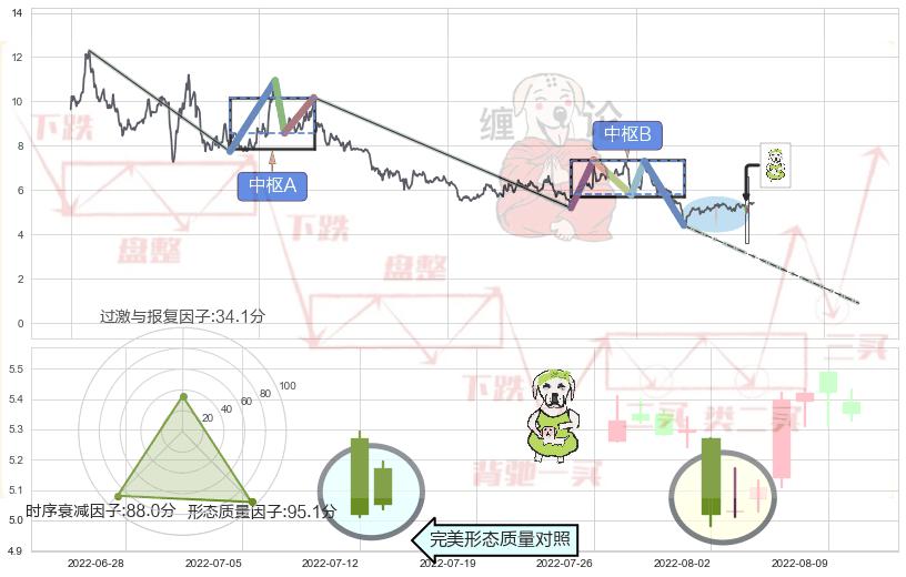 ➣ 下跌镊子线(n形磁铁) + 缠论中枢点破位中枢B支撑下拉信号叠加后【目标达成率】中等,【看空】信号叠加【存续影响中等】