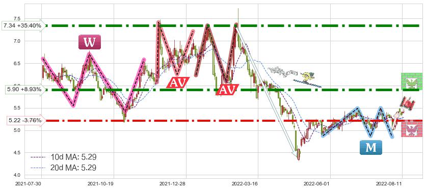 ➣ 【仅预测突破】最后价格:5.42与预测突破价格:5.02→【空间中等】后续最小【反转】第一目标价格→(2022-09-13: 4.62 )