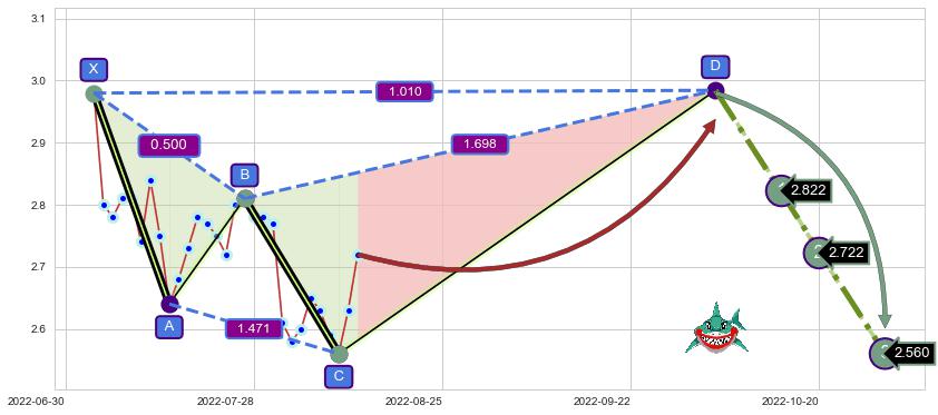 ➣ 未完成【鲨鱼】形态起点X: 2022-07-05, 已到达C点: 2022-08-10, 预测最终D点: 2022-10-05, 共67交易日