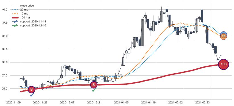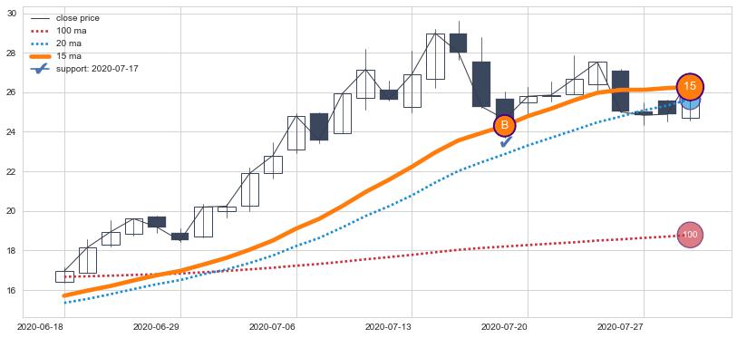 📝 多条均线形成死叉后走势最低价格达到: 21.00
