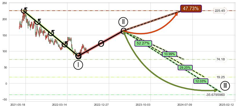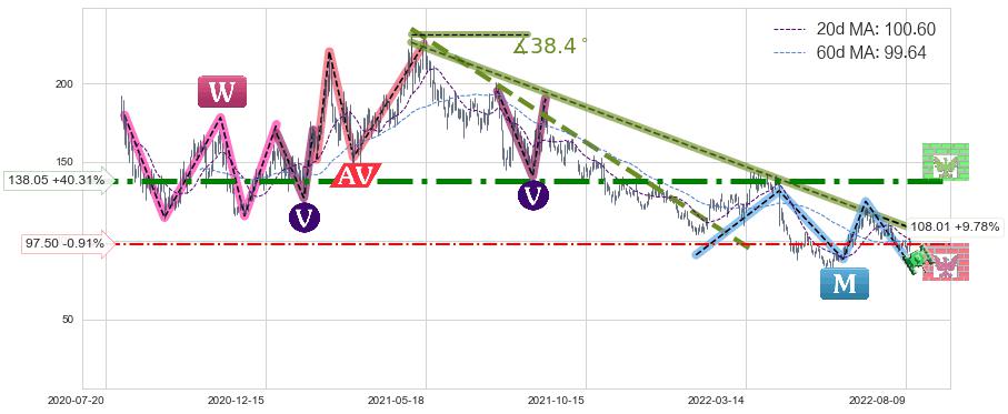 ➣ D点拟合预测价格131.02,距离最后交易收盘价格98.39相差 +33.16%